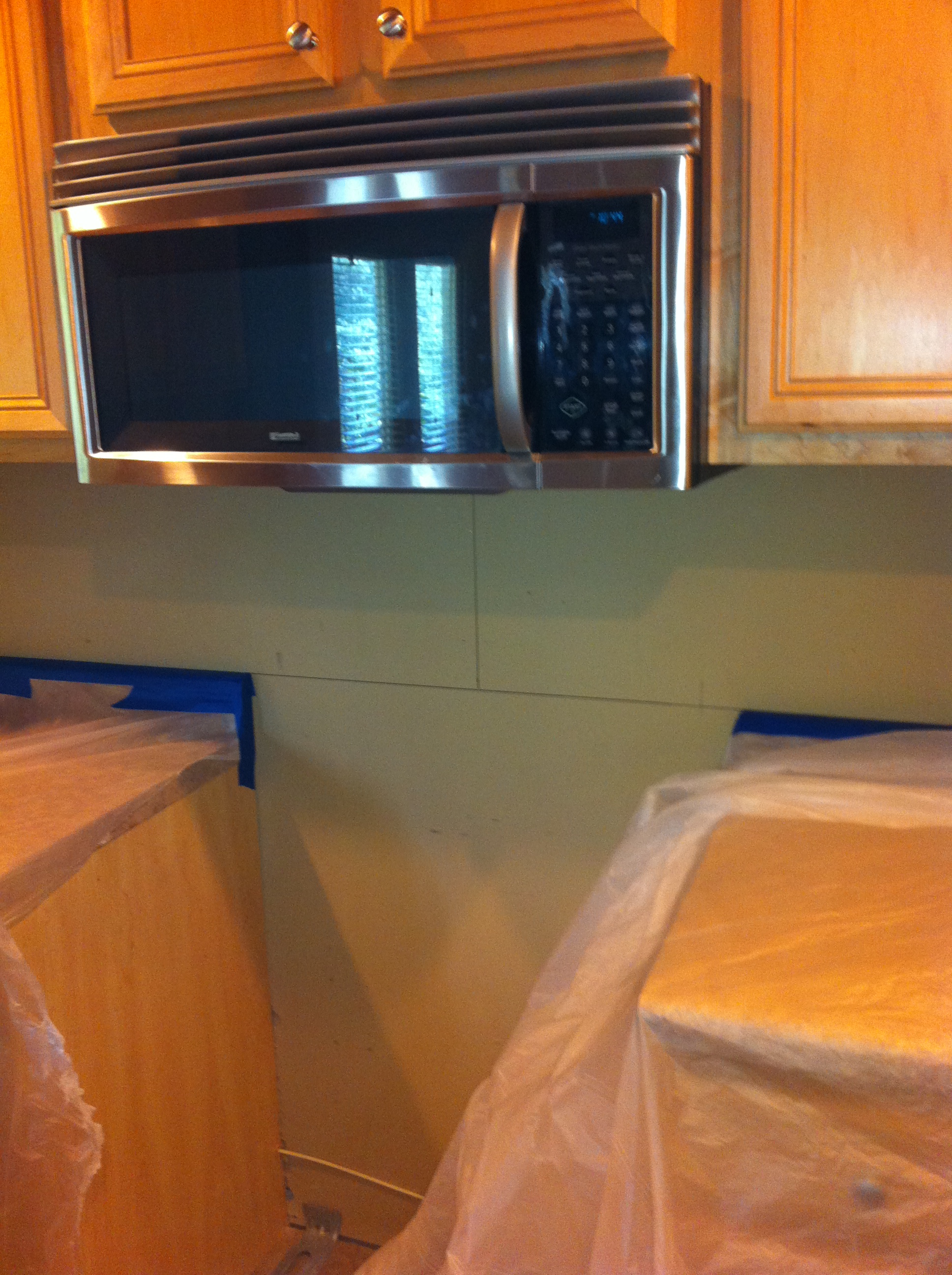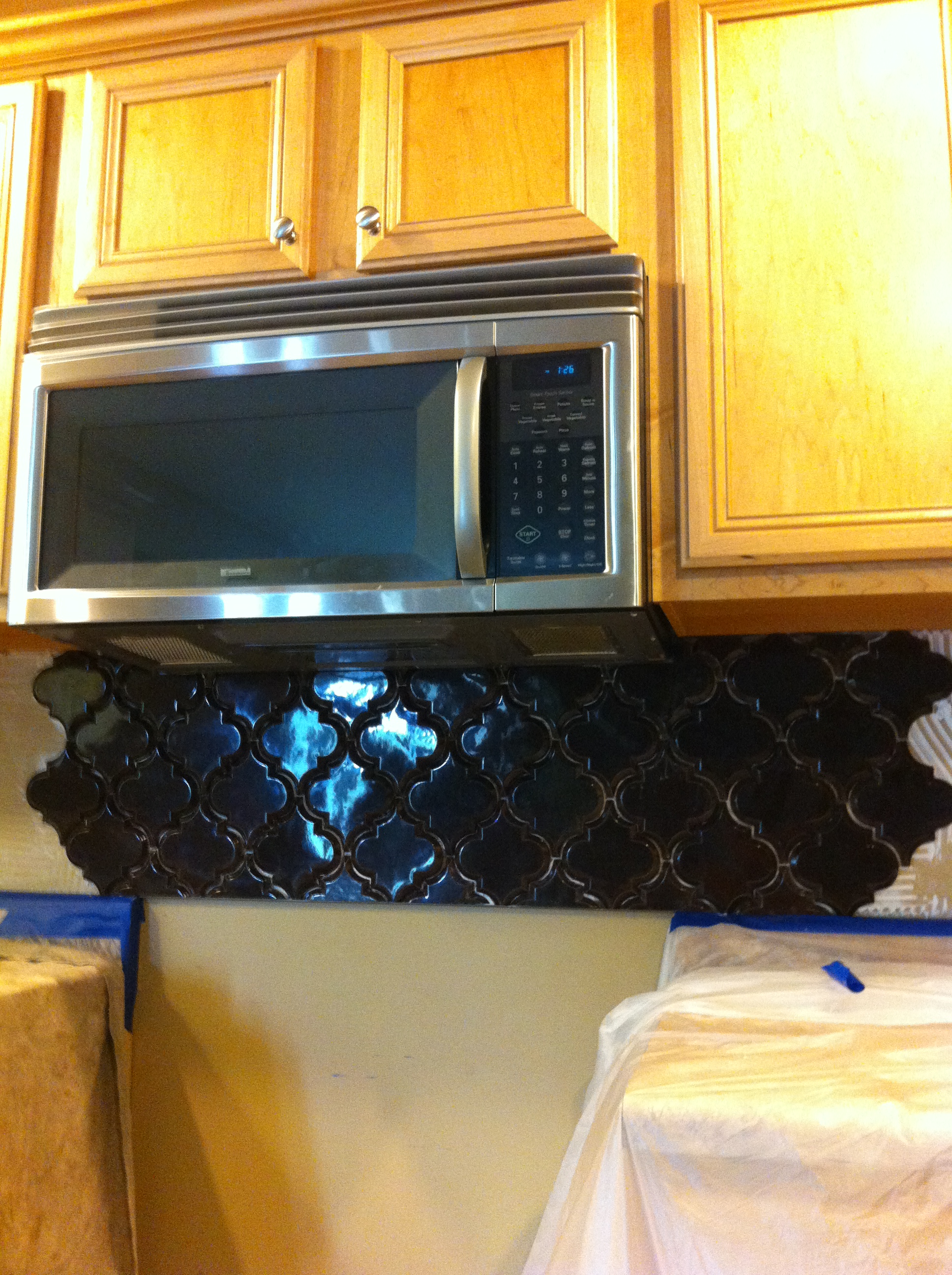 Step 1: This step by step instruction can be used as a guideline for installing beveled arabesque tile. These steps can be modified to fit your installation and they are designed to help you overcome obstacles encountered with this odd shaped tile. The first step is simple protect the counter-top. We use plastic over the counter-tops with a drop-cloth over the plastic for two layers of protection. This is also a good step to outline where the tile starts (centerline under microwave) and where the tile stops (horizontal line between back splash. With the shape of this tile, we don’t want to offset the center line because we want the two corners to be the same size (this is a U shaped kitchen, this is the center wall that the other two walls meet up with).