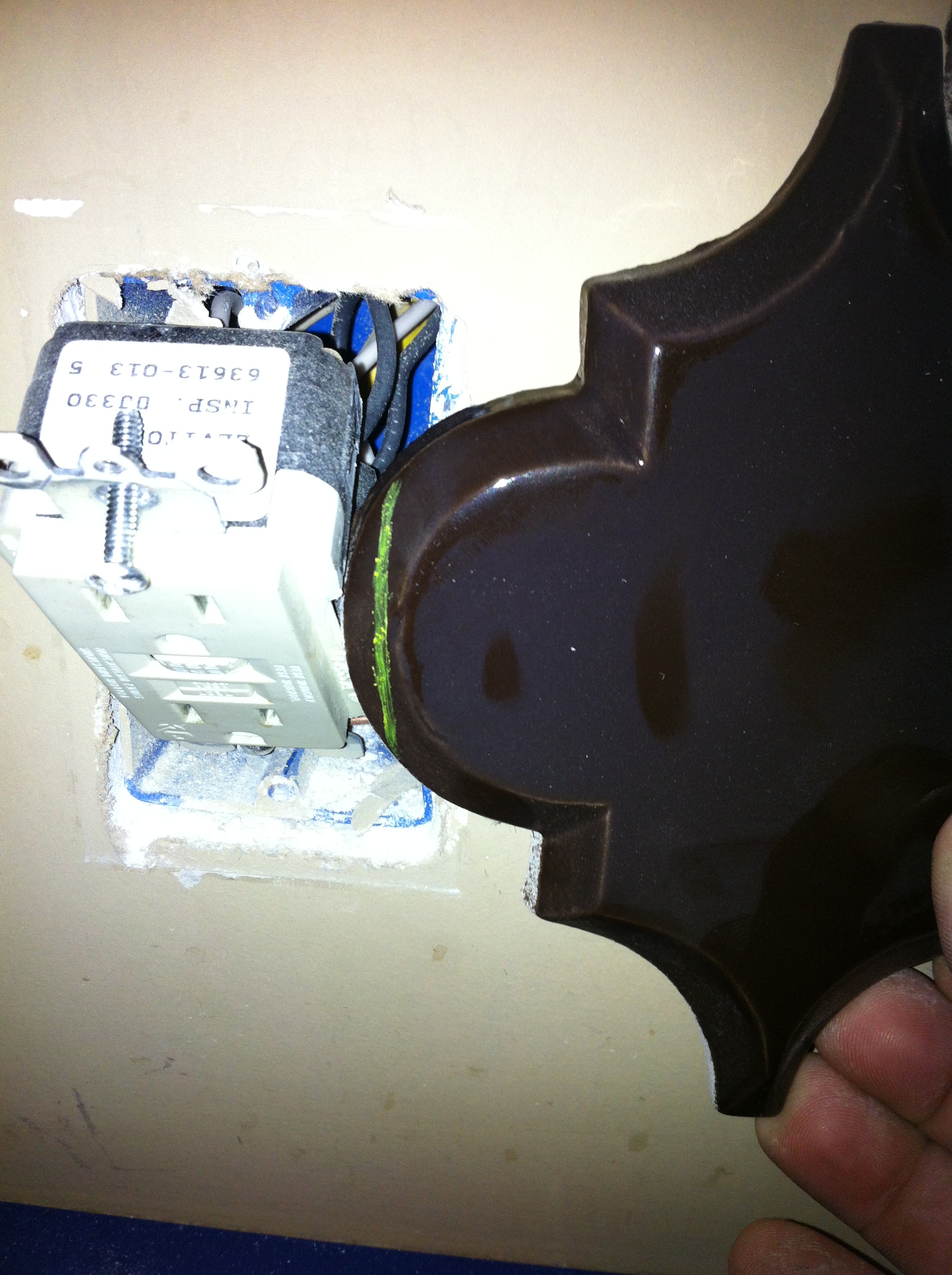 These next few pictures show how to cut around obstacles in the wall. Outlets are the most common, but it is likely you will also have to cut around cabinets and windows. The best way to do that with beveled arabesque tile is to hold it in place and mark it. Since this tile is dark in color, I am using a yellow grease pencil. The other advantage of the grease pencil is the line is less likely to wash off when I cut it with my wet saw (tile saw).
