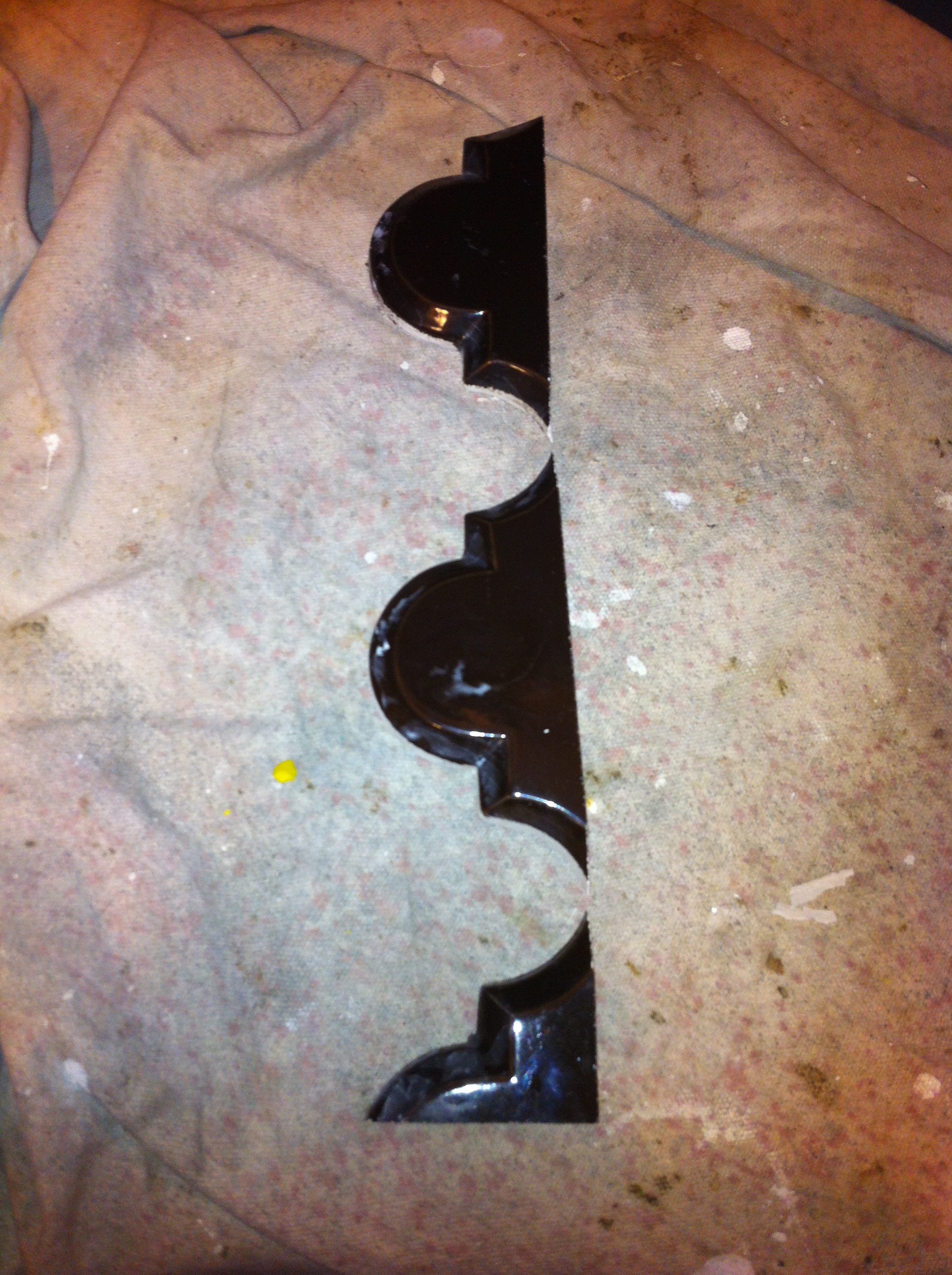 Notice that I am not spreading adhesive on the wall for these cuts. I am back-buttering these beveled arabesque tiles (spreading the adhesive directly on the tile itself instead of the wall) to make the tile easier to mark. Using this method I also don’t have to worry about my tile saw getting adhesive on it either.