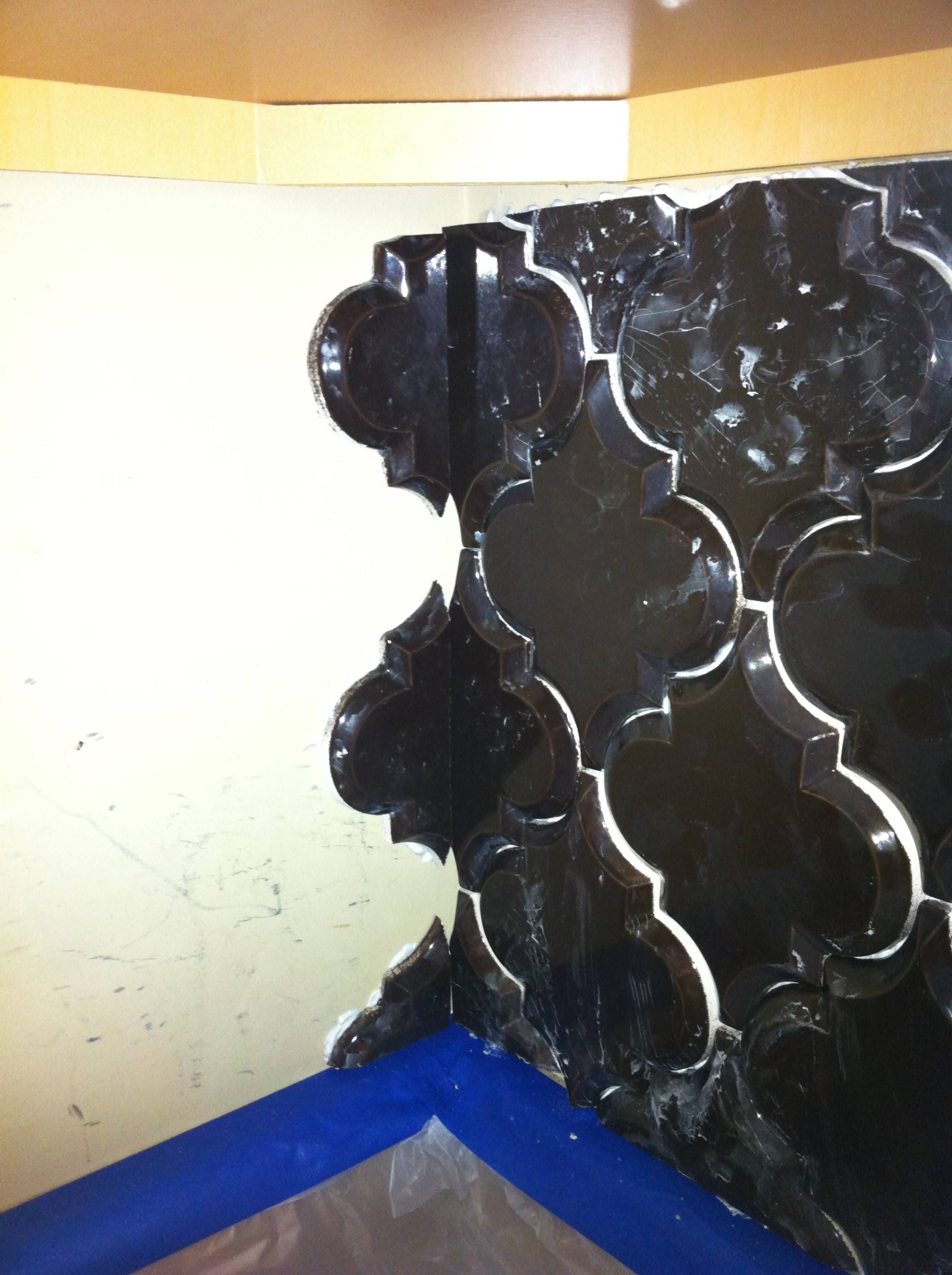 When you get to the corner of a wall, the pieces you cut off will be the starter pieces on the next wall (start from the cornet and work toward the final edge). You must start in the corner of the second wall to keep the same tile pattern going from wall to wall. The picture below is of these same tiles mounted in their permanent position.