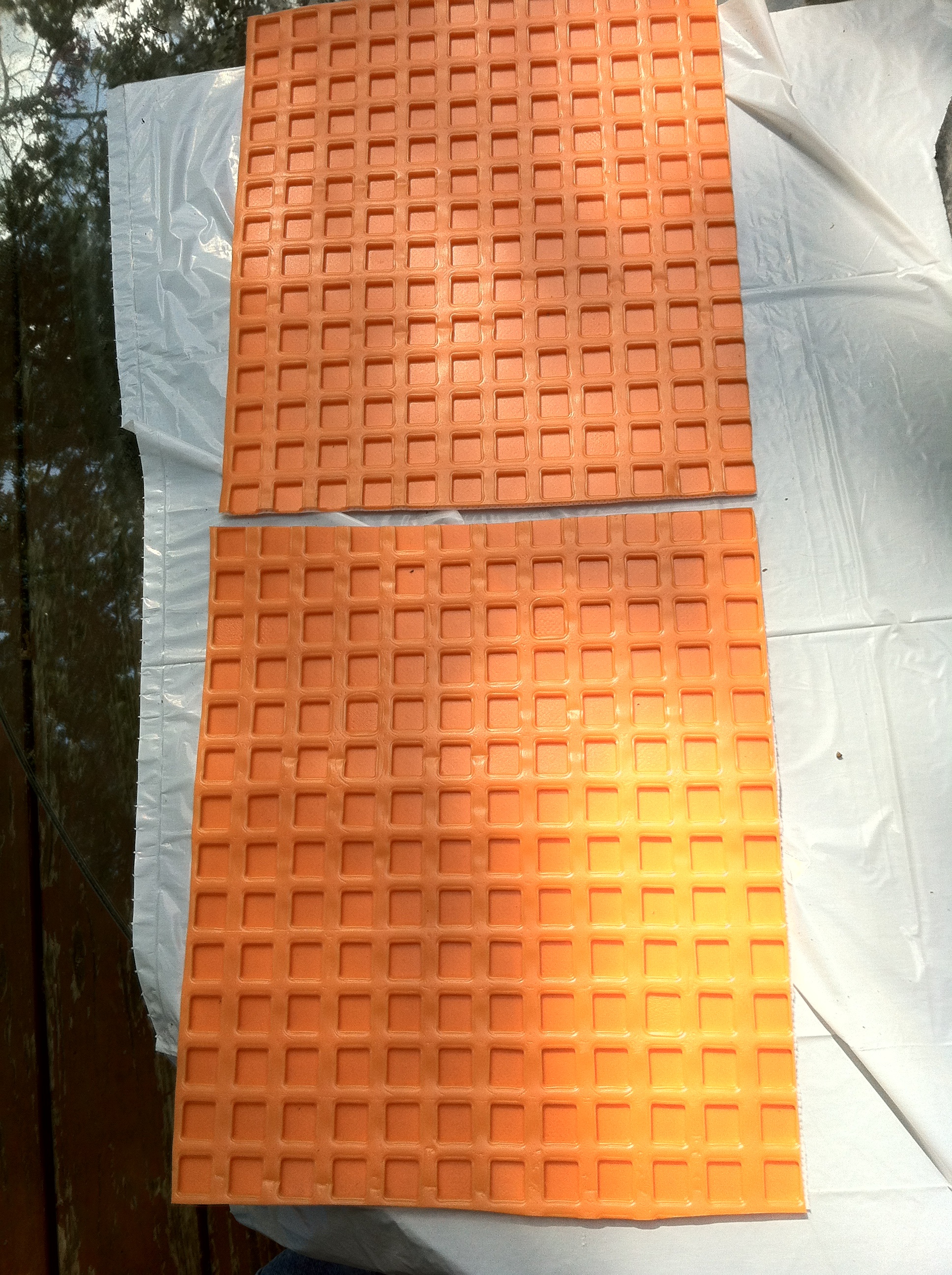 The floor of the cardboard box is made up of two pieces of Schluter Ditra. I used two pieces instead of a single piece to show how to waterproof Ditra seems. To waterproof Ditra, simply thinset a 5″ piece of Kerdi Band or strip of Kerdi over the seem and your floor seem is waterproof.